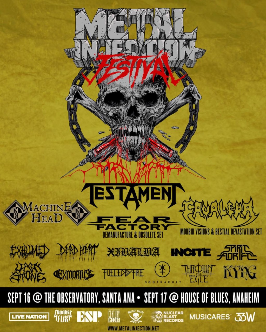 | Metal Injection is pleased to announce the debut of its very own two-day festival! The inaugural Metal Injection Festival will take over Orange County, CA from September 16-17 across two iconic venues – The Observatory and House of Blues Anaheim. The stacked and diverse lineup is a melting pot of genres, inclusive to both legendary bands as well as emerging and underground artists worth discovering. The full lineup is as follows: Saturday, September 16 @ The Observatory$35 Ticket [On Sale Now]Max & Iggor Cavalera (Performing a special Morbid Visions and Bestial Devastation set)ExhumedInciteFueled By Fire Dead Heat Sunday, September 17 @ House of Blues Anaheim$50 Ticket [Public On Sale June 16 @ 10:00 A.M. PDT]TestamentMachine HeadFear Factory – (Performing a special Demanufacture & Obsolete set)XibalbaSpirit AdriftExmortusKyngContracult CollectiveUpon StoneThrown Into Exile |